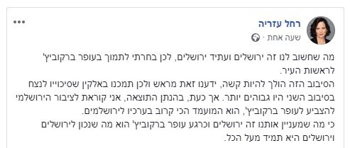 חה"כ רחל עזריה, שפרשה מהמירוץ לראשות עיריית ירושלים לאחר שחתמה עם המועמד שהפסיד גם הוא השר זאב אלקין, הודיעה הערב (ראשון) לקראת סיבוב הבחירות השני, כי היא תומכת במועמד עופר ברקוביץ.