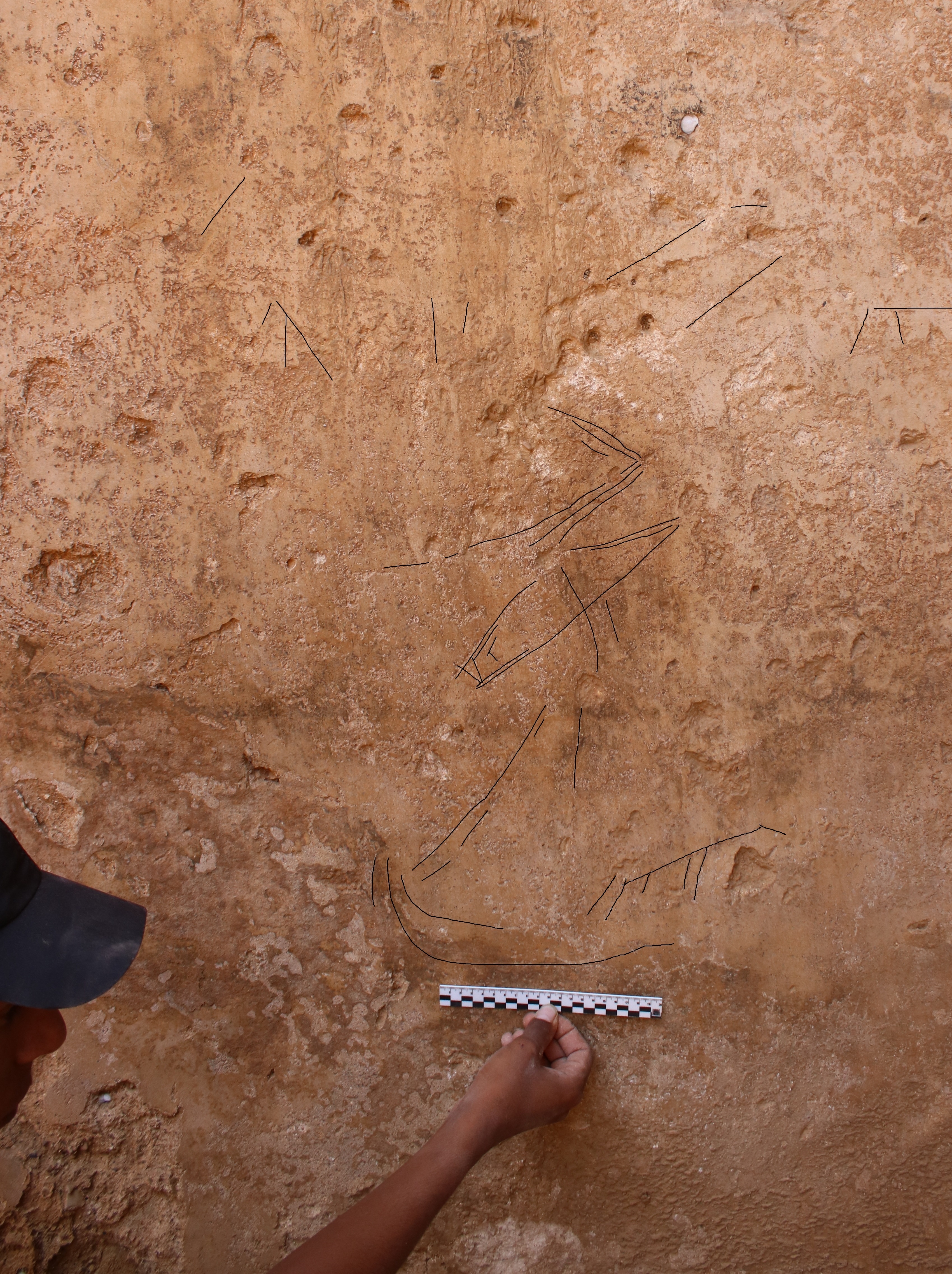 בטיח המכסה את פנים הבור זיהו מנהלי החפירה, ד"ר דוידה אייזנברג-דגן ואבישי לוי-חברוני מרשות העתיקות, קווים חרותים. אמנם, רבים מהקווים היטשטשו עם הזמן, אולם ניתן לראות כי הקווים הדקים שנחרתו מייצגים ספינות, מלח, ומספר בעלי חיים. בקירות המאגר נחרתו לפחות 13 ספינות.