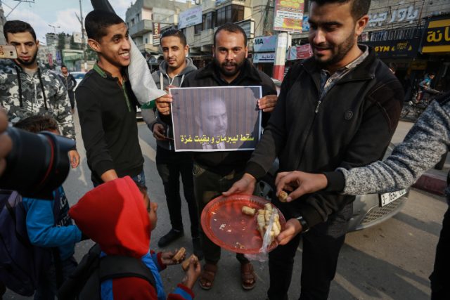 פעילי חמאס מחלקים סוכריות לציון הפרישה של ליברמן (צילום: עבד ראהים חאטיב\פלאש 90)