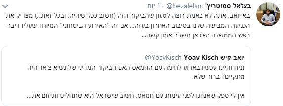 "נניח והיינו עכשיו באירוע לחימה עם החמאס, האם הביקור המדיני של נשיא צ'אד היה מתקיים? ברור שלא", כתב קיש בחשבון הטוויטר שלו והוסיף כי "אין לי ספק שאנחנו לפני עימות עם חמאס. חשוב שישראל היא שתחליט ותיזום את המהלך ולא תיגרר ללוחות זמנים של החמאס".