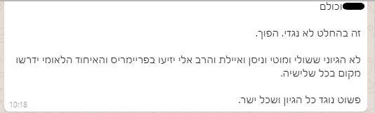 "לא הגיוני ששולי ומוטי וניסן ואיילת והרב אלי יזיעו בפריימריס והאיחוד הלאומי ידרשו מקום בכל שלישיה. פשוט נוגד כל הגיון ושכל ישר", כתב אחד הפעילים בקבוצה הסגורה. "שילכו לפריימריז", קרא אחר על הסוגייה המרכזית, לפיה בבית היהודי מתמודדים הח"כים לבחירה ואילו באיחוד לאומי הח"כים משוריינים ברשימה. מה הבעיה שתקומה יתמודדו בפריימריס כמו כולם? למה חייבים לשריין מראש?
