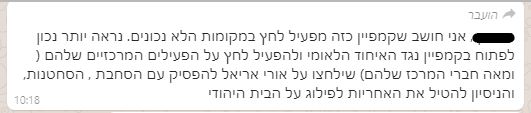 עוד אחד הוסיף כי "נראה יותר נכון לפתוח בקמפיין נגד האיחוד הלאומי ולהפעיל לחץ על הפעילים המרכזיים שלהם (ומאה חברי המרכז שלהם) שילחצו על אורי אריאל להפסיק עם הסחבת, הסחטנות, והניסיון להטיל את האחריות לפילוג על הבית היהודי".