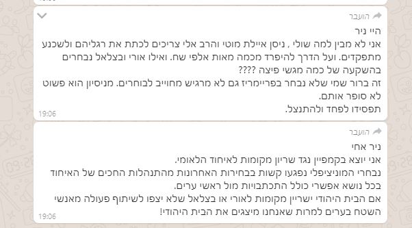 "ניר אחי אני יוצא בקמפיין נגד שריון מקומות לאיחוד הלאומי. נבחרי המוניציפלי נפגעו קשות בבחירות האחרונות מהתנהלות החכים של האיחוד בכל נושא אפשרי כולל התכתבויות מול ראשי ערים. אם הבית היהודי ישריין מקומות לאורי או בצלאל שלא יצפו לשיתוף פעולה מאנשי השטח בערים למרות שאנחנו מיצגים את הבית היהודי"!