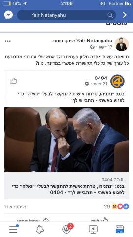 במקביל, שיתף יאיר נתניהו בחשבון הפייסבוק שלו את תגובת בנט לדברים מאתר 0404 וכתב גם הוא בתגובה: "נו ואתה עשית את זה מליון פעמים כנגד אמא שלי עם נוני מוזס ועם כל עורך של כל כלי תקשורת אפשרי במדינה. נו ו?", דברי הבן.