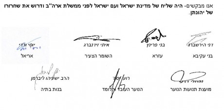 "אנו, חברי תנועות הנוער בישראל, מבקשים ממך ראש ממשלת ישראל כי תפעל מתוך ההבנה שאין מצווה גדולה כפדיון שבויים. אנו מבקשים- היה שליח של מדינת ישראל ועם ישראל לפני ממשלת ארה"ב ודרוש את שחרורו של יהונתן."