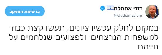 אמסלם הוסיף וכתב: "קצת כבוד למתים ולפצועים שנלחמים על חייהם. ממשלת ישראל לא תהיה אדישה לגל הטרור הזה ואל לנו להשלים עם העובדה שתמיד יהיו כאן פצועים והרוגים. את הטרור הזה אנחנו נחסל".