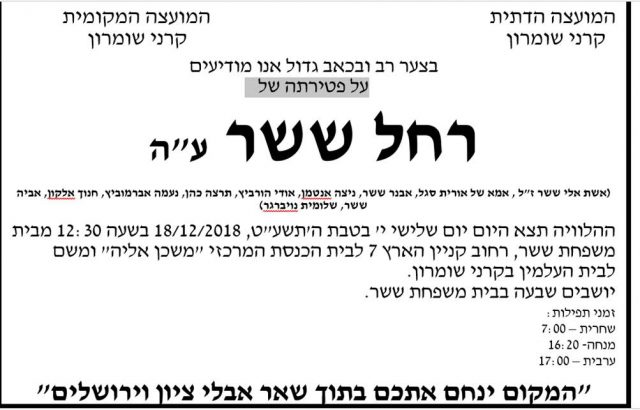 הלוויתה של הרבנית ששר נערכה בשעה 12:30 בבית העלמין בקרני שומרון. מהיישוב נמסר כי יושבים שבעה בבית משפחת ששר.