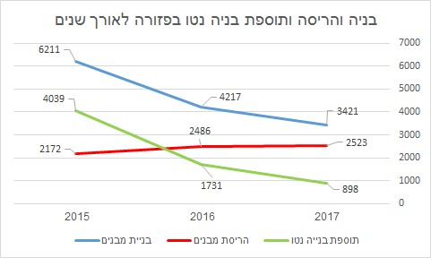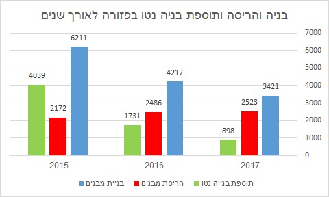 עוד ציין כי "ב-2017 נוספו 3421 מבנים בלתי חוקיים בנגב לעומת כמעט כפליים בשנת 2015 אז נבנו 6211 מבנים בלתי חוקיים בנגב. ירידה של 45% . במקביל, חל גידול בהריסות הבנייה הבלתי חוקית בנגב. בשנת 2015 הרסו רשויות האכיפה 2,172 מבנים בלתי חוקיים בנגב. בשנת 2017 עמד מספר ההריסות על 2,523 מבנים. גידול של 16% בהשוואה ל 2015".