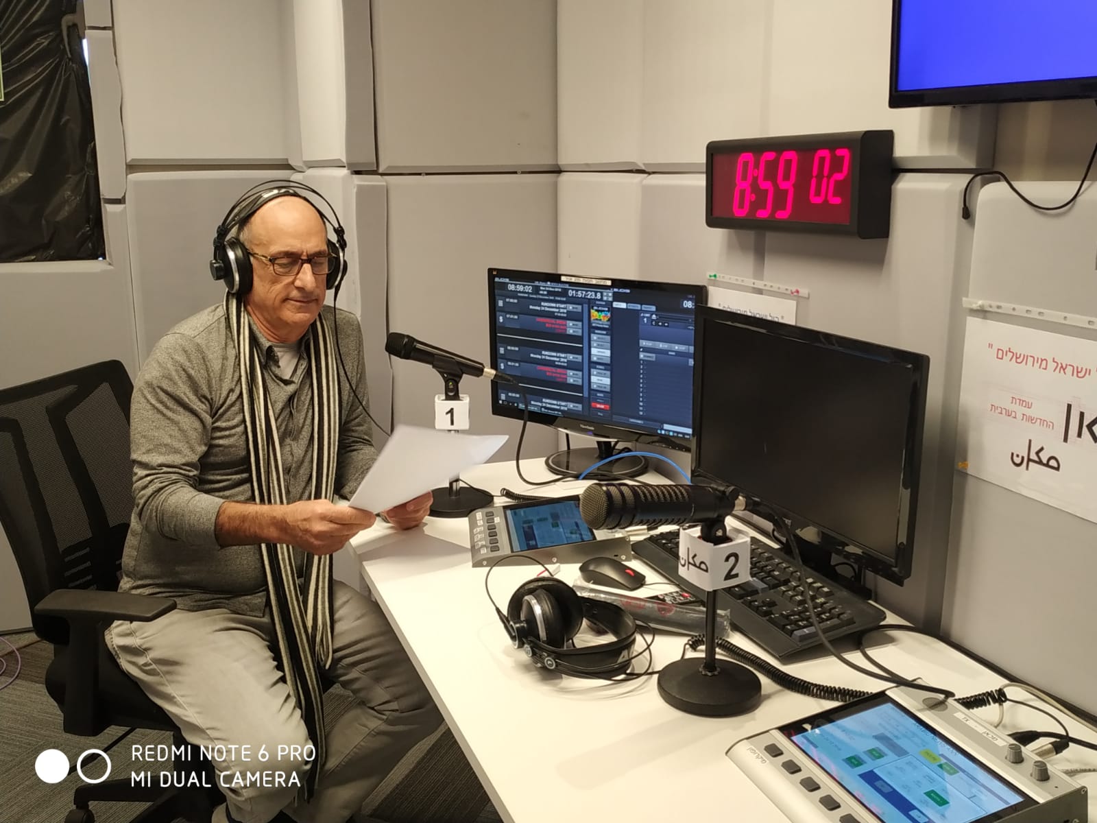 בתמונה: קריין החדשות הותיק צבי סלטון בדקה שלפני מהדורת 9 הבוקר (צילום: כאן)