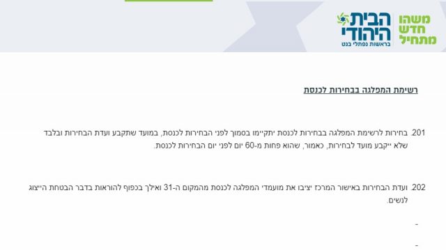 מתוך חוקת הבית היהודי בסעיף 201, הבחירות לרשימת המפלגה בבחירות לכנסת יתקיימו בסמוך לפני הבחירות לכנסת, במועד שתקבע ועדת הבחירות ובלבד שלא ייקבע מועד לבחירות, כאמור, שהוא פחות מ-60 יום לפני יום הבחירות לכנסת". משכך, ככל הנראה הפריימריז בבית היהודי יתקיימו לכל המאוחר עד ה-8 בפברואר.