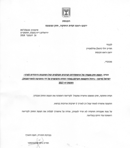 ח״כ ניסן סלומינסקי יו״ר ועדת החוקה פנה הבוקר (רביעי) ליו״ר הכנסת ח״כ יולי אדלשטיין על מנת שיאפשר להעלות להצבעה במליאה לקריאה ראשונה את הצעת חוק החטיבה להתיישבות.