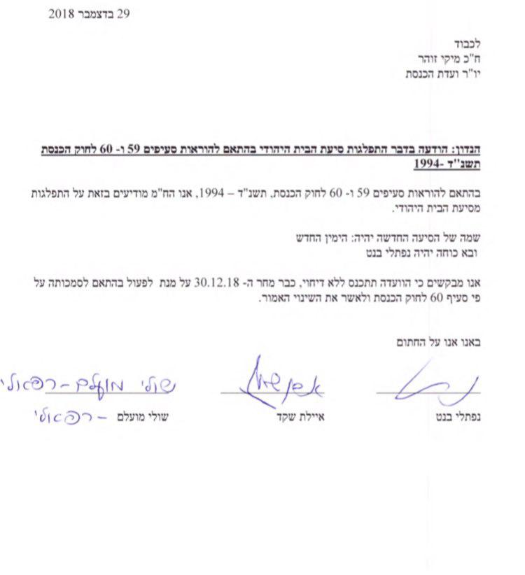 בתוך כך, הגישו בנט ושקד הודעות פרישה מחברות בבית היהודי וביקשו להסיר אותם מרשימת המתפקדים. השניים יחד עם שולי מועלם שלחו מכתב ליו"ר ועדת הכנסת כדי שזה יכנס את הועדה בבקשתם להתפצל מרשימת הבית היהודי. הדיון בועדת הכנסת נקבע למחר בשעה 11:30. לפי חוק המפלגות, שליש סיעה יכול להתפצל ולרוץ כמפלגה נפרדת שתקבל כספי מימון מפלגות.