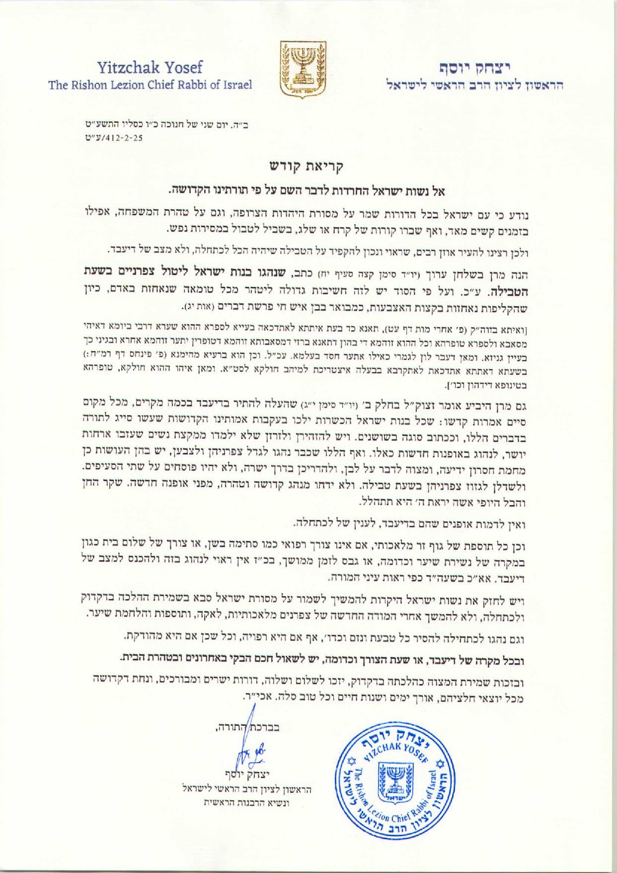 ב"קריאת קודש אל נשות ישראל החרדות לדבר השם על פי תורתנו הקדושה" שנכתבה לפני כחודש והופצה היום עלי ידי הרבנות הראשית לישראל יוצא הראשון לציון הרב יצחק יוסף נגד נשים המגדלות ציפורניים ומושחות אותן בלק.