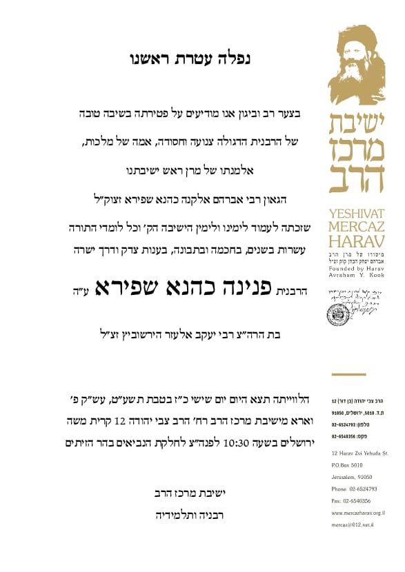 ברוך דיין האמת: נפטרה הרבנית פנינה שפירא ז"ל