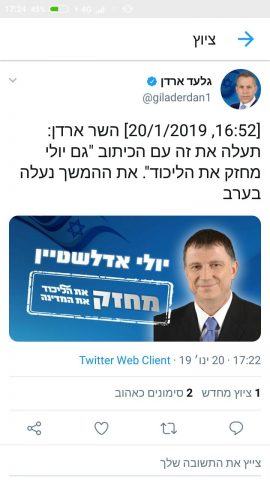 השר גלעדן ארדן העלה בטעות ציוץ לחשבון הטוויטר שלו בו נכתב "השר ארדן: תעלה את זה עם הכיתוב "גם יולי מחזק הליכוד". את ההמשך נעלה בערב", ככל הנראה הודעה ששלח ארדן לדוברו הסרוג סעדיה גרודצקי והועלתה בלי כוונה לרשת.