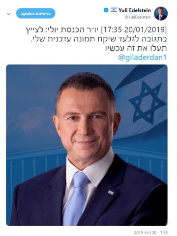 בתגובה העלה יו"ר הכנסת ציוץ תגובה: "יו״ר הכנסת יולי: לצייץ בתגובה לגלעד שיקח תמונה עדכנית שלי. תעלו את זה עכשיו". לשניים היסטוריה של דאחקות משותפות ואנשי תקשורת חושדים שמאחורי הקלעים המעשה מבויים. אם כי ציוצו של ארדן נמחק והועלה מחדש.