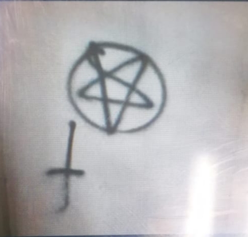 על הקיר רוססו כתובות על השטן וסמלים המקושרים לכת השטן.