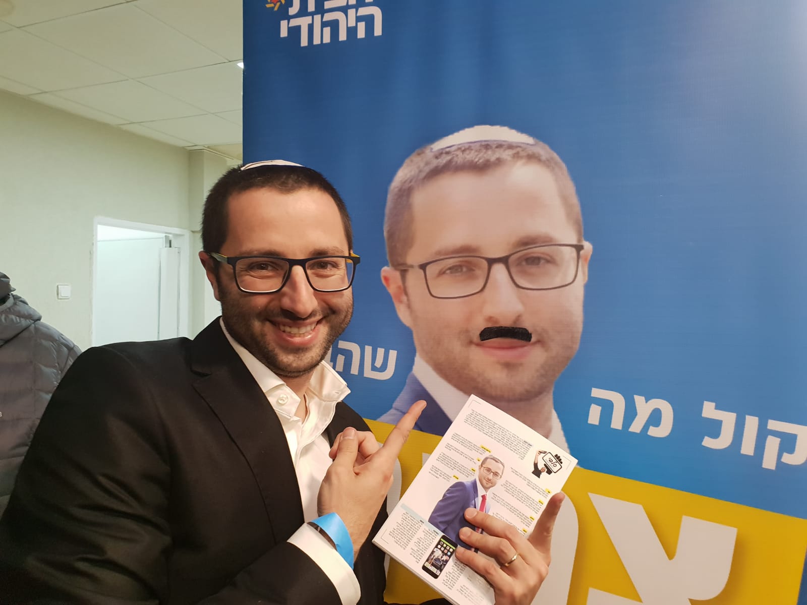 יונתן דובוב ליד השפם שציירו על הפוסטר שלו
