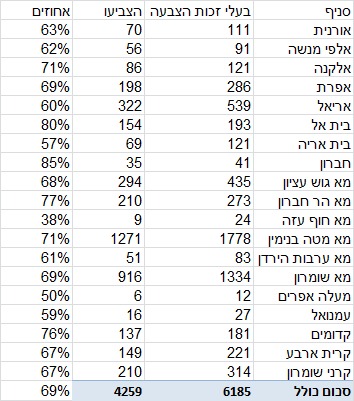 אחוזי ההצבעה הגבוהים ביותר נרשמו בחברון עם 85% ואילו הנמוך ביותר נרשם במעלה אפריים, שם נענו רק 50%. סך הכל ביש"ע הצביעו 4,256 מתוך 6,185 בעלי זכות בחירה.