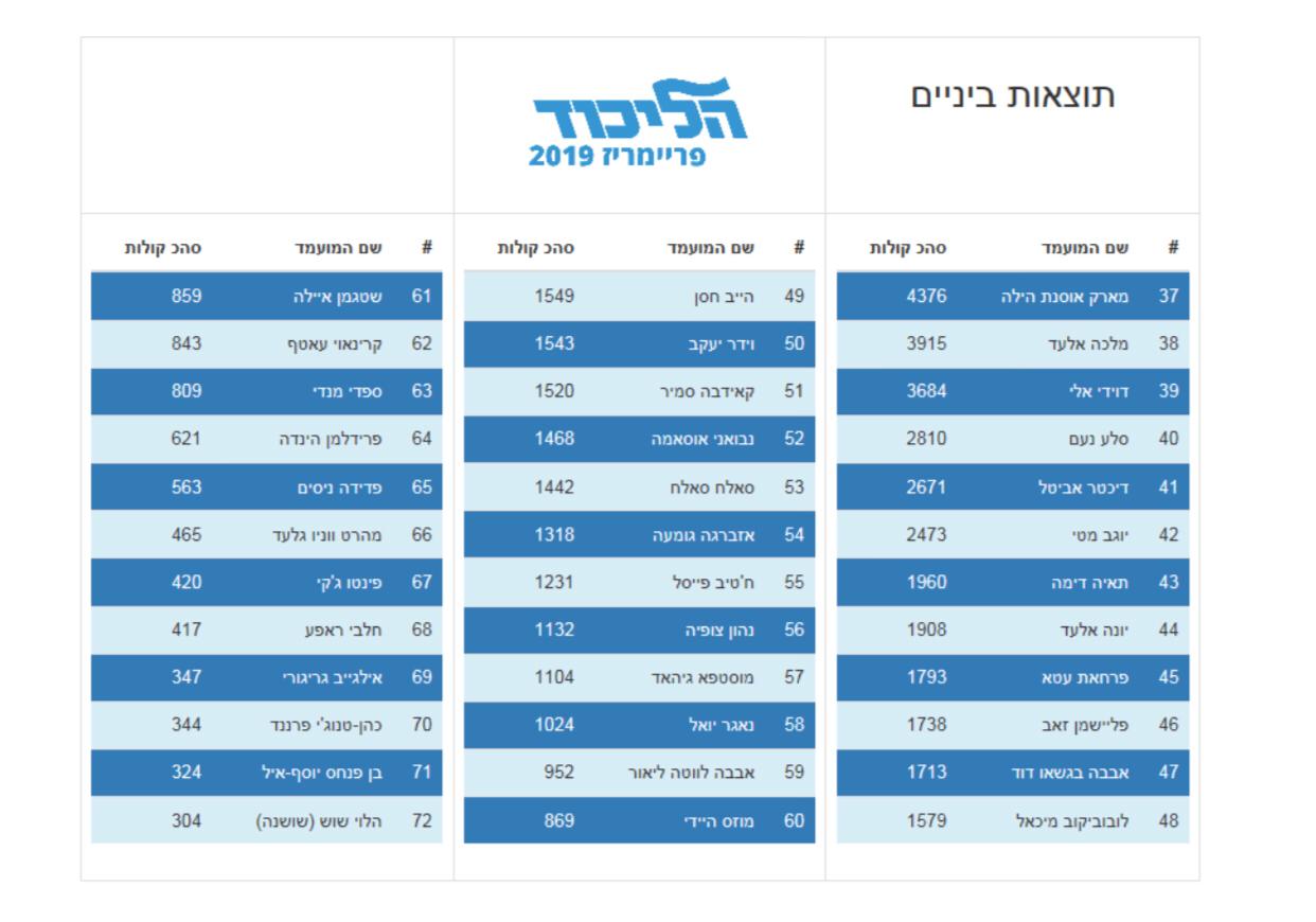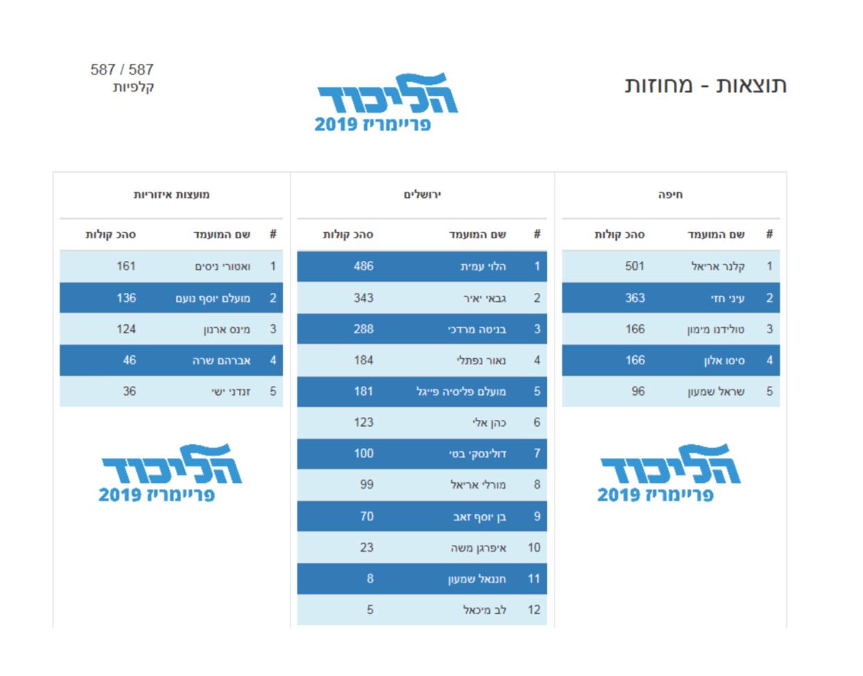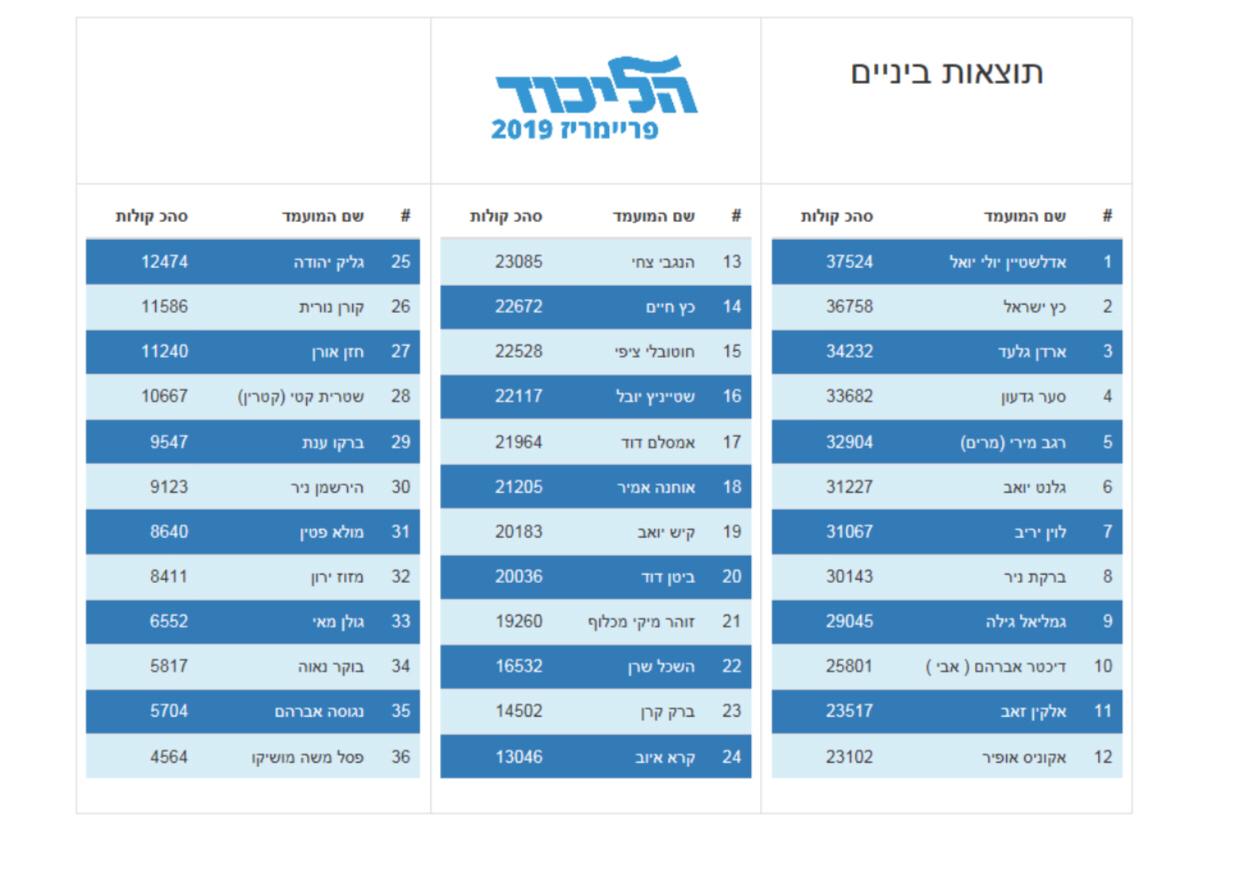 בסופו של דבר, אלו התוצאות המלאות והאמתיות, כאשר בעשירייה ראשונה הוצב במקום הראשון, יולי אדלשטיין 2. ישראל כץ 3. גלעד ארדן 4. גדעון סער 5. מירי רגב 6. יואב גלנט 7. יריב לוין 8 ניר ברקת. 9. גילה גמליאל 10. אבי דיכטר