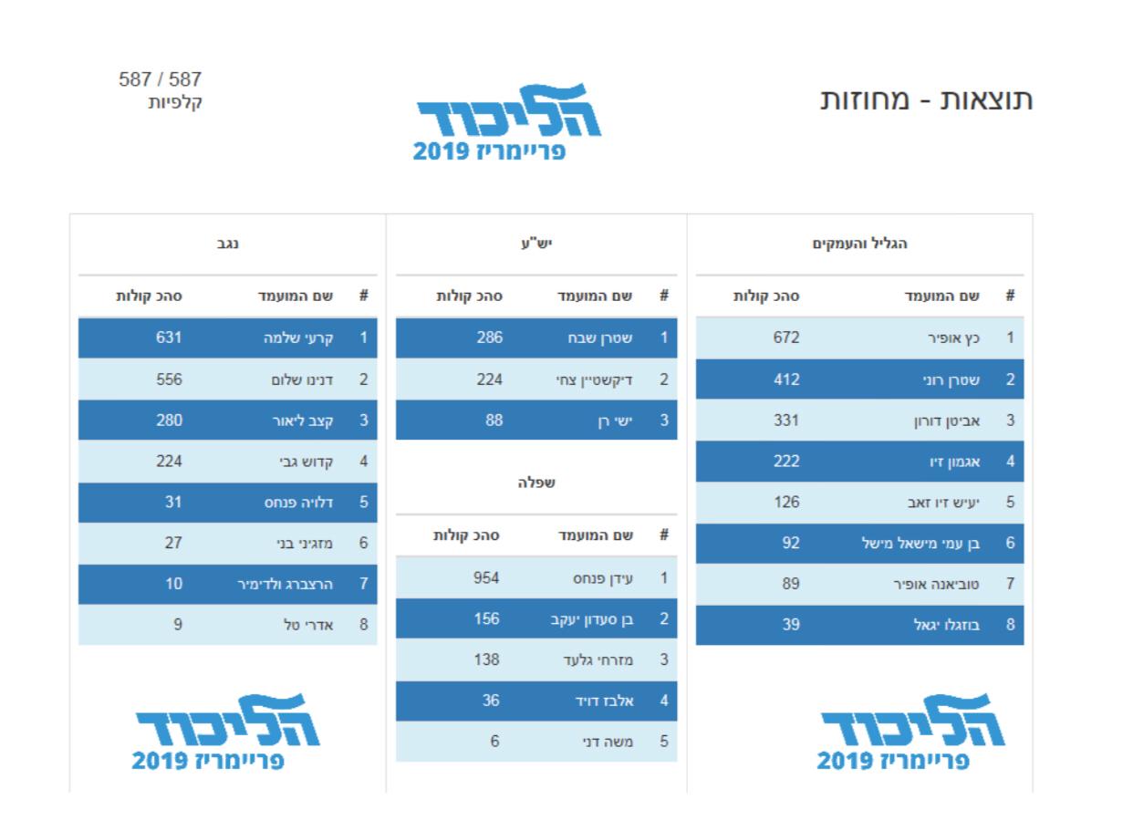 הקלפיות נסגרו אמש בשעה 22:00 ומבין כ-120 אלף מתפקדי הליכוד, 69,719 הצביעו בסך הכל. אחוז ההצבעה הסופי עמד על 58 אחוז מבעלי זכות ההצבעה. מדובר בעלייה בהשוואה לפריימריז הקודם, לאחר שבשנת 2015 אחוז ההצבעה הסופי עמד על כ-52 אחוז.