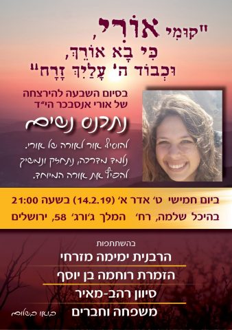 בני הנוער של היישוב תקוע, בו חיה וגדלה אורי אנסבכר ז"ל, פתחו אמש (מוצ"ש) ביוזמה מיוחדת לזכרה תחת הכותרת: "להיות עם חופשי בארצנו – מפיצים את האור של אורי".