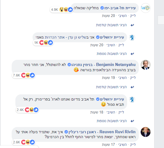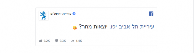 האהבה המשעשעת שהחלה בין עמודי הפייסבוק של עיריית תל אביב ועיריית ירושלים בחגיגות השנה הלועזית והמשיכה בעקיצה על השלג שלא מגיע לתל אביב, ממשיכה לפרוח ולהביא עוד שלל פוסטים קורעים שכובשים את הרשת.