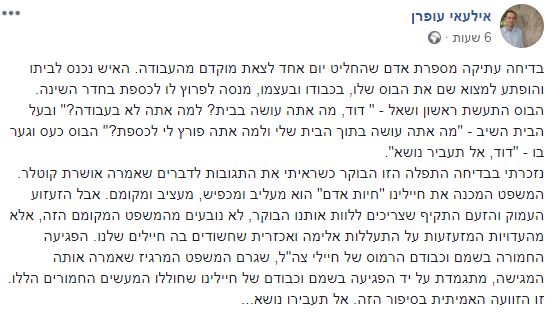 הרב עופרן פרסם פוסט בעמוד הפייסבוק שלו וכתב: "בדיחה עתיקה מספרת אדם שהחליט יום אחד לצאת מוקדם מהעבודה. האיש נכנס לביתו והופתע למצוא שם את הבוס שלו, בכבודו ובעצמו, מנסה לפרוץ לו לכספת בחדר השינה. הבוס התעשת ראשון ושאל – " דוד, מה אתה עושה בבית? למה אתה לא בעבודה?" ובעל הבית השיב – "מה אתה עושה בתוך הבית שלי ולמה אתה פורץ לי לכספת?" הבוס כעס וגער בו – "דוד, אל תעביר נושא".