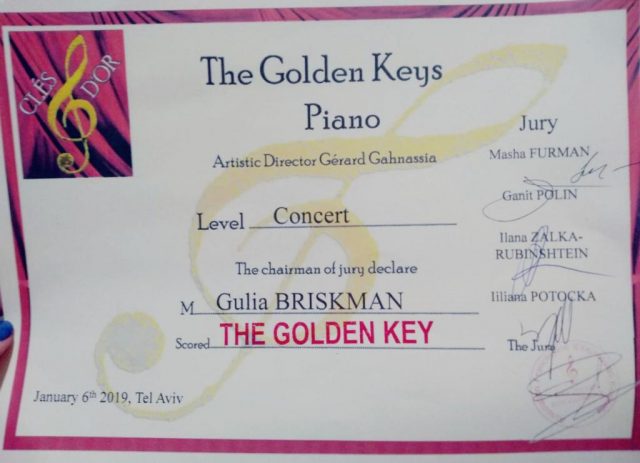 לראשונה בתחרות הפסנתר הבינלאומית "the golden keys", שנערכה לאחרונה בתל אביב- זכתה המוזיקאית החרדית יוליה בריסקמן שחזרה בתשובה לפני 30 שנה ועלתה לישראל ממוסקבה.