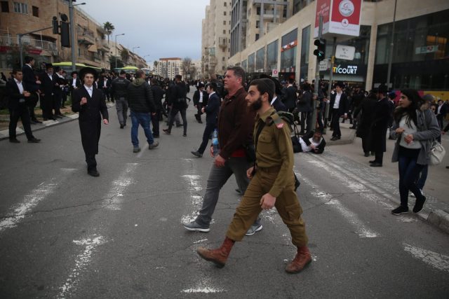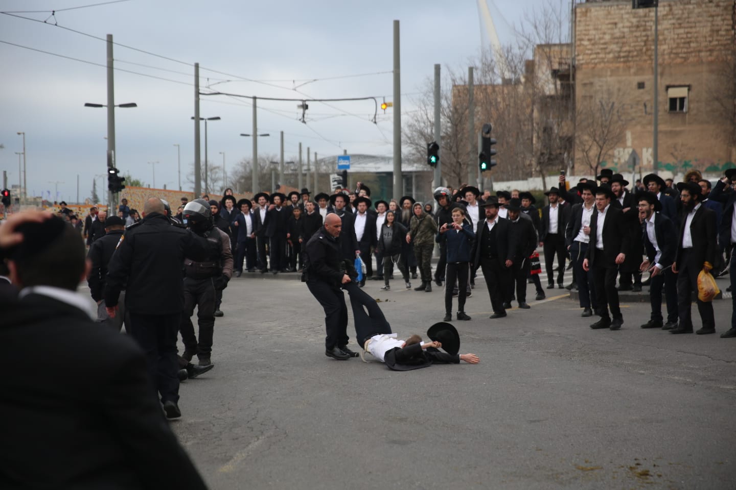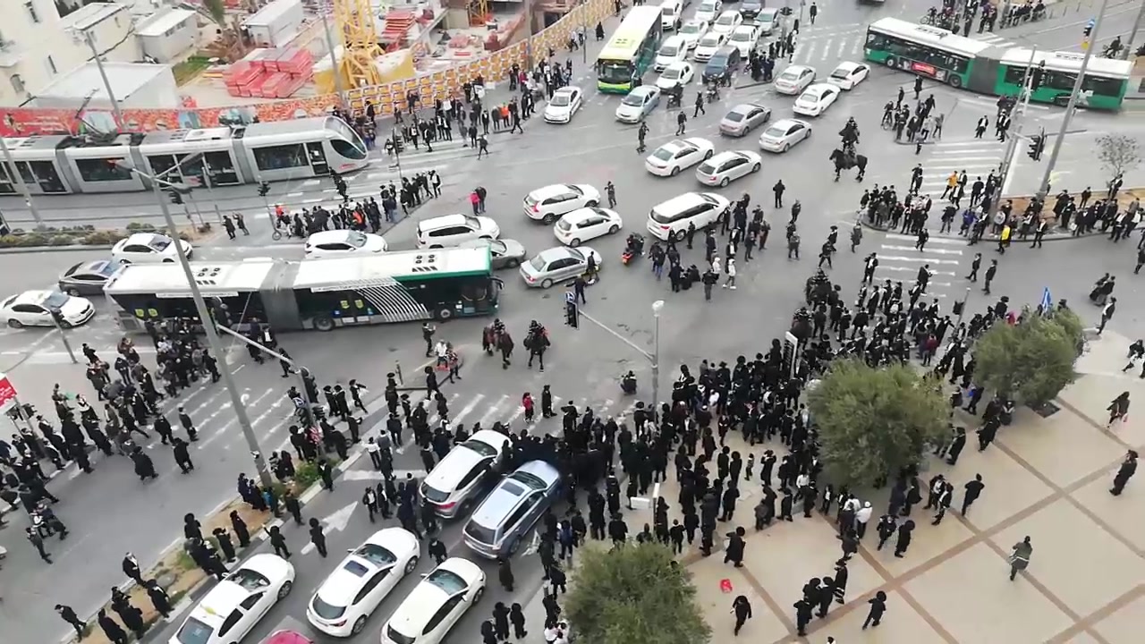 צומת הרחובות יפו ושרי ישראל נסגרה לתנועה והרכבת הקלה פועלת לסירוגין, זאת כאמור לאחר שהעריק, בן 26 לא התייצב בלשכת הגיוס מזה 5 שנים. המפגינים קראו בין היתר לעבר השוטרים "נאצים", "גזירת הגיוס, גזירת שמד". עוד צעקו: "לכלא ולא לצבא", "נמות ולא נתגייס".