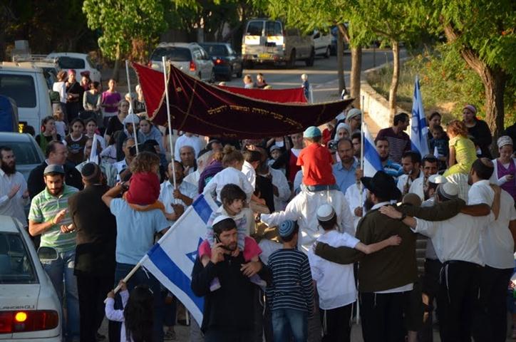 מול בית הכנסת נעצרה התהלוכה כש הרב לבנון והרב עמיאל שטרנברג עוטפים את הרב שמעון בטלית חדשה שעליה בירך להתעטף בציצית וברכת 'שהחיינו'.