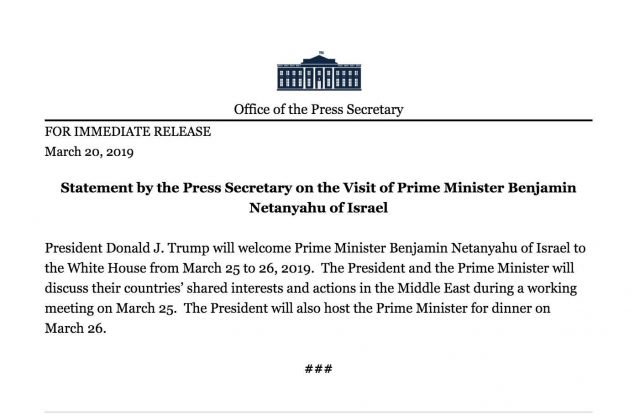 שבועיים לפני מועד הבחירות בישראל: נשיא ארצות הברית טראמפ ייפגש עם ראש הממשלה נתניהו ביום שני הקרוב, כך הודיעו בבית הלבן בהזמנה רשמית. ביום למחרת, ייארח הנשיא את נתניהו לארוחת ערב עם בכירי הממשל האמריקני ביום שלישי.
