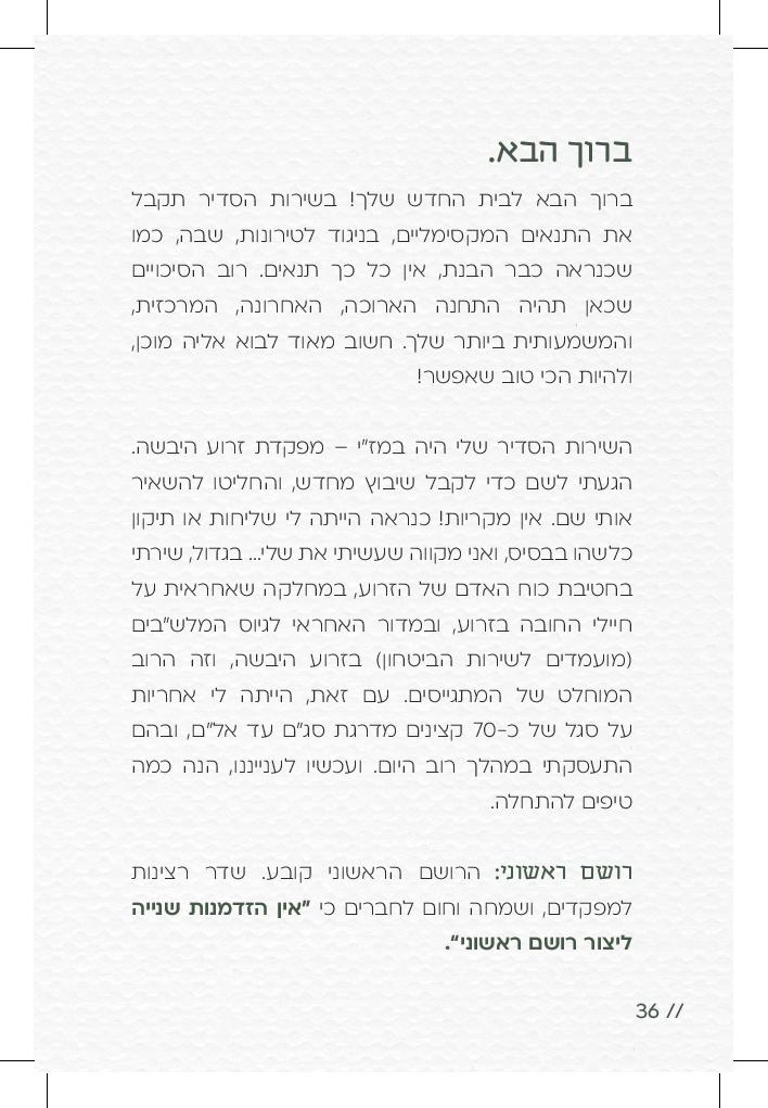 מדין הכרת הטוב, אני חייבת לציין שקיבלתי את הספרון עבור בני שהתגייס לפני חודשים מספר לשירות עורפי, והספרון התאים לו בדיוק. ספרון קליל, ופשוט מהנה לקריאה! לא האמנתי שבני סיים...