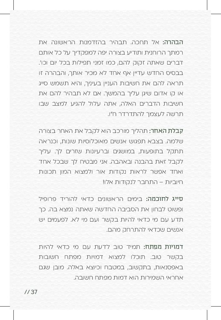 ספר מרתק! עזר לי מאוד במהלך השירות. התרשמתי מאוד מהמחבר, מטוהר כוונותיו וטוב ליבו. מעורר השראה!