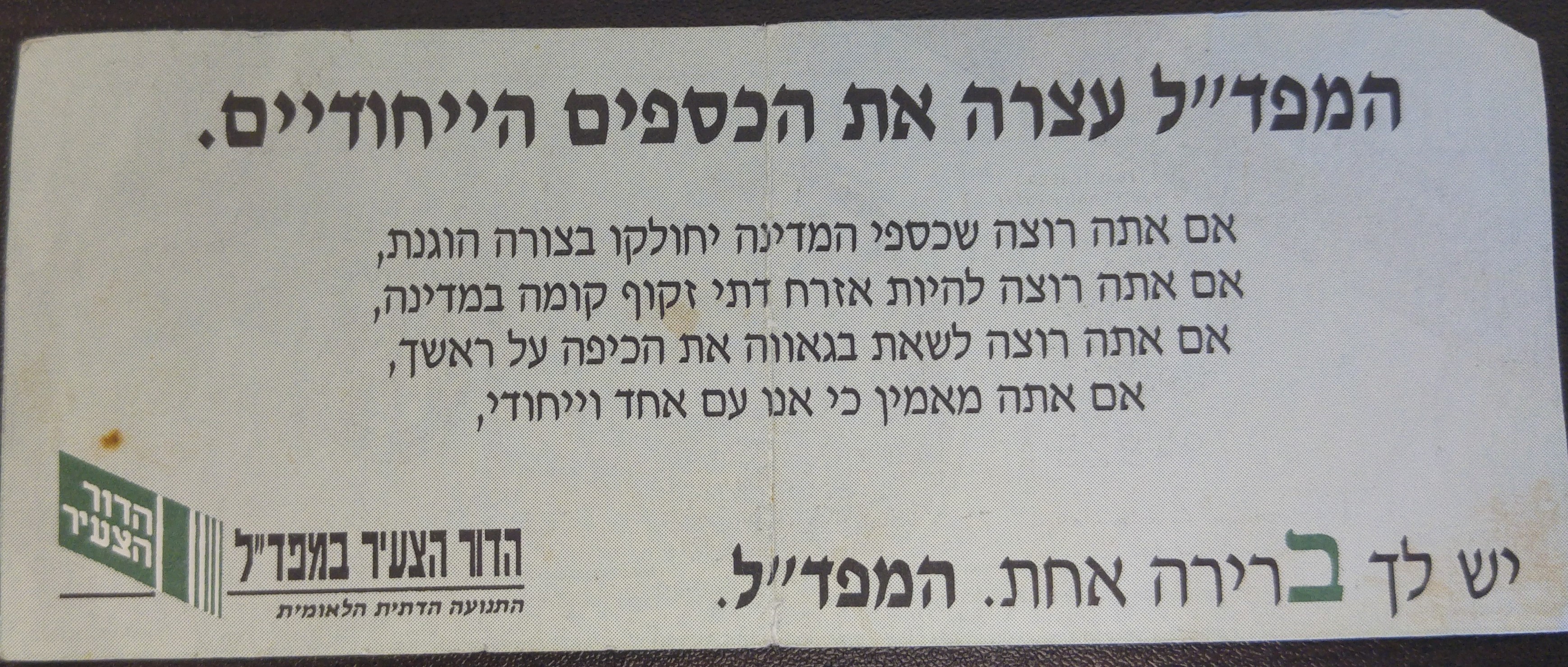 שלושה הסטיקרים של המפד"ל – מ-84' בלי אבל הצבע מפדל, 88' צריך אמונה במדינה ו-92 המפדל לימינך, הביאו לניסיונות שכנוע שיכולים לעבוד גם היום – אני בוגר ישיבת בני עקיבא – לכן אני מצביע …"