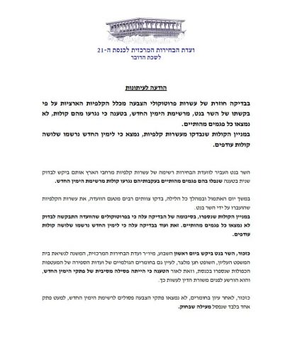 במשך יום האתמול ובמהלך כל הלילה, בדקו צוותים רבים מטעם הוועדה, את עשרות הקלפיות שהועברו על ידי בנט. אולם כאמור, במניין הקולות שנספרו, בסיכומה של הבדיקה עלה כי בפרוטוקולים שהוועדה התבקשה לבדוק לא נמצאו כל פגמים מהותיים. "זאת ועוד בבדיקה עלה כי לימין החדש נרשמו שלושה קולות עודפים", צויין עוד בוועדה.