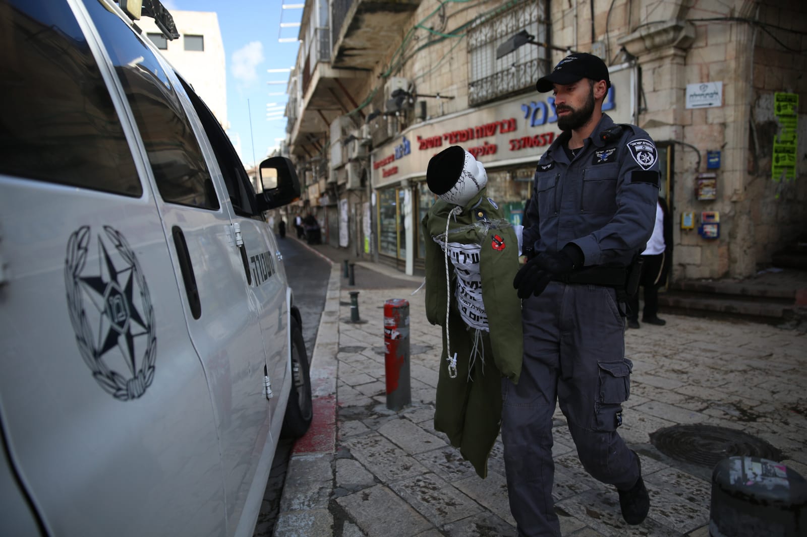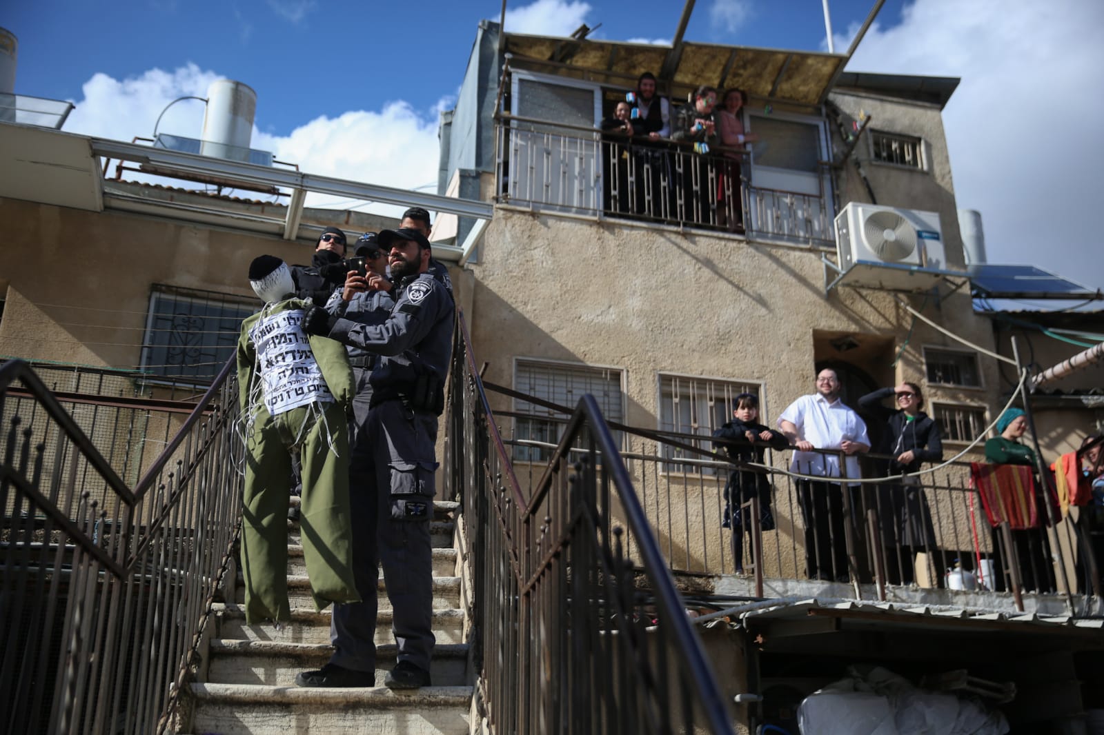 לא רק בפורים: בובה ועליה מדים של חייל צה"ל נתלתה לפנות ערב באחד הגגות בשכונת מאה שערים בירושלים, על ידי חרדים קיצוניים. בתום המהומות, היא הורדה על ידי לוחמי מג"ב.