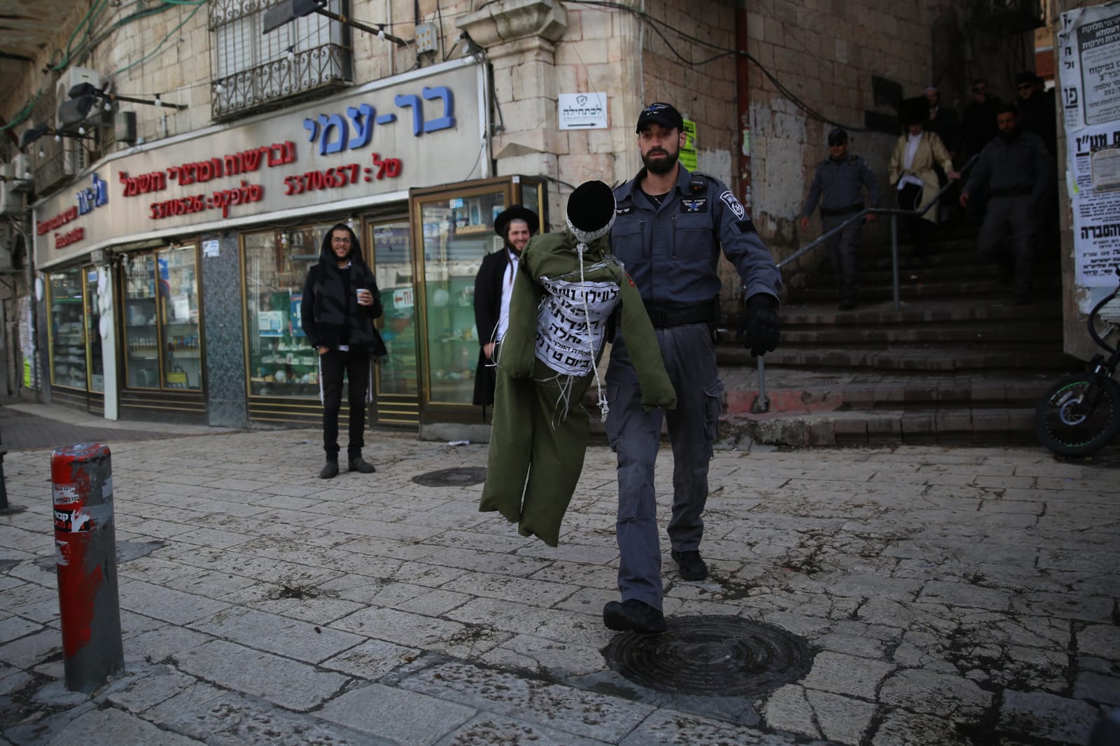 לא רק בפורים: בובה ועליה מדים של חייל צה"ל נתלתה לפנות ערב באחד הגגות בשכונת מאה שערים בירושלים, על ידי חרדים קיצוניים. בתום המהומות, היא הורדה על ידי לוחמי מג"ב.