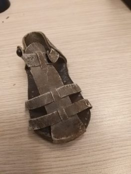 הפריט השני – הוא סנדל עור שתפר אביה של ניצולת השואה הלן גולדפלם צפניה בת 76, דיירת במגדלי הים התיכון ברמת השרון.