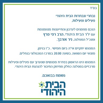 בצד המו"מ עם בין איחוד מפלגות הימין עם הליכוד להרכבת הקואליציה, יו"ר הבית היהודי הרב רפי פרץ מתחיל הערב סבב פגישות עם פעילי המפלגה לאחר הבחירות. המטרה: חיבור מחדש לשטח וסיכום קמפיין הבחירות.