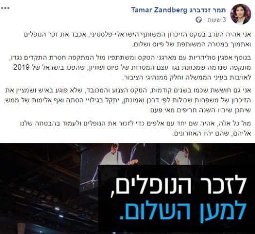 בפוסט שפרסמה בעמוד הפייסבוק שלה, כתבה זנדברג: "אני אהיה הערב בטקס הזיכרון המשותף הישראלי-פלסטיני, אכבד את זכר הנופלים ואתמוך במטרה המשותפת של פיוס ושלום. בנוסף אפגין סולידריות עם מארגני הטקס ומשתתפיו מול המתקפה חסרת התקדים נגדו, מתקפה שנדמה שמכוונת נגד עצם המטרות של פיוס ושוויון, שהפכו בישראל של 2019 לאויבות בעיני הממשלה וחלק ממנהיגי הציבור".
