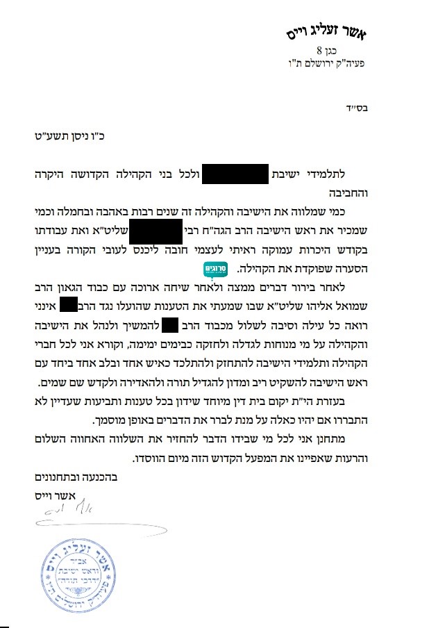 במכתב שמופנה לתלמידי הישיבה ובני הקהילה שסביבה, כותב הרב וייס בין השאר: "כמי שמלווה את הישיבה והקהילה זה שנים רבות באהבה ובחמלה וכמי שמכיר את ראש הישיבה הרב … ואת עבודתו בקודש היכרות עמוקה, ראיתי לעצמי חובה ליכנס לעובי הקורה בעניין הסערה שפוקדת את הקהילה.