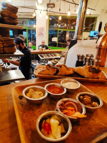 כל מאפה מגיע עם מבחר סלטים ביתיים טריים, כמו: סלט גזר של ערב שבת לצד טחינה סמיכה ועשירה, או ירקות כבושים.