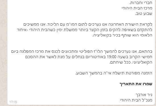 בתוך כך הודיעו כי "אנו נערכים להמשך הלו"ז הפוליטי ומתכוונים לכנס את מרכז המפלגה ביום חמישי הקרוב בשעה 19:00 באודיטוריום בנחלים על מנת לאשר את ההסכם הקואליציוני, ככל שיחתם".
