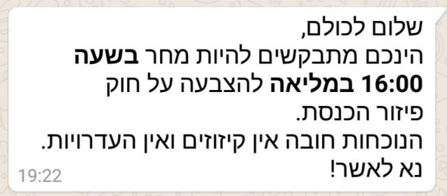 הח"כים מהליכוד קיבלו הודעה: "הגיעו למליאה מחר ב-16:00 להצבעה על חוק פיזור הכנסת. הנוכחות חובה אין קיזוזים ואין העדריות".