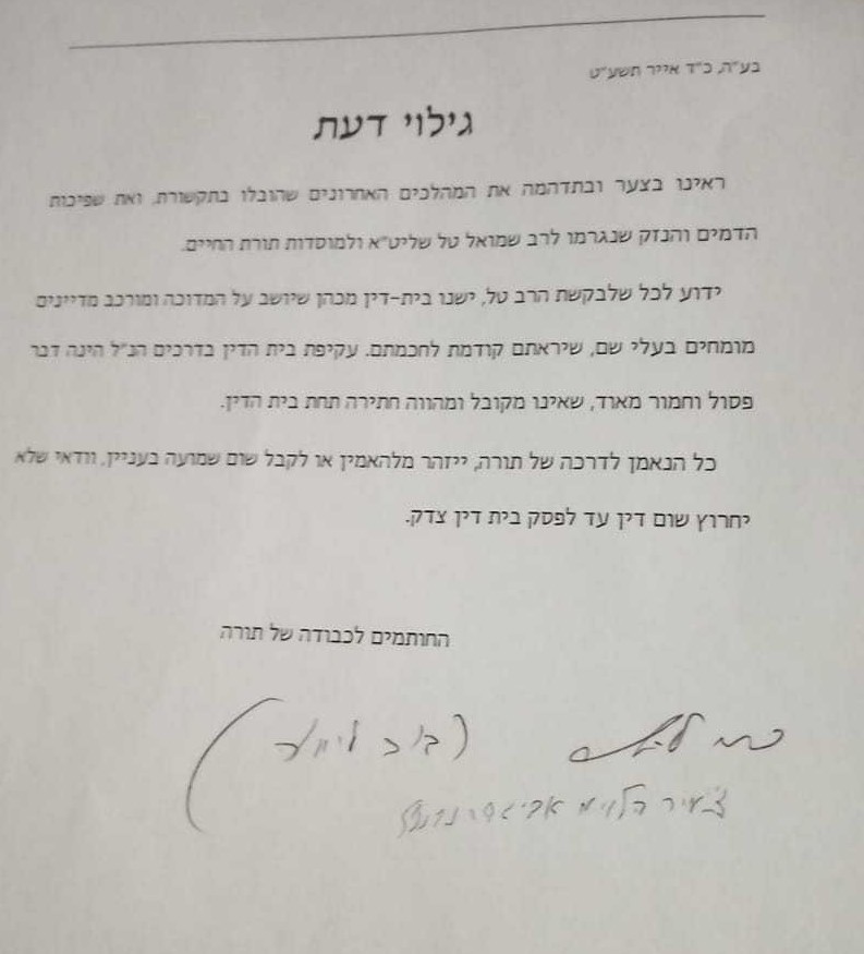 במכתב שהגיע לידי סרוגים, עליו חתומים שני הרבנים הם כותבים: "ראינו בצער ובתדהמה את המהלכים האחרונים שהובלו בתקשורת ואת שפיכות הדמים והנזק שנגרמו לרב שמואל טל שליט"א ולמוסדות תורת החיים.