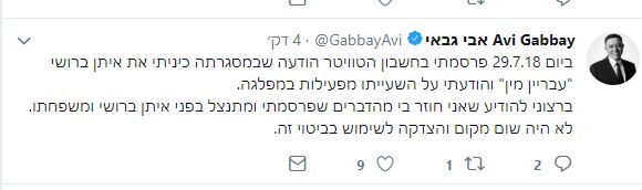 זמן קצר לאחר מכן פרסם ח"כ אבי גבאי הודעה בטוויטר: "ביום 29.7.18 פרסמתי בחשבון הטוויטר הודעה שבמסגרתה כיניתי את איתן ברושי "עבריין מין" והודעתי על השעייתו מפעילות במפלגה. ברצוני להודיע שאני חוזר בי מהדברים שפרסמתי ומתנצל בפני איתן ברושי ומשפחתו. לא היה שום מקום והצדקה לשימוש בביטוי זה."
