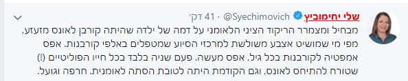 בציוץ בטוויטר כתבה: "מבחיל ומצמרר הריקוד הציני הלאומני על דמה של ילדה שהיתה קורבן לאונס מזעזע, מפי מי שמושיט אצבע משולשת למרכזי הסיוע שמטפלים באלפי קורבנות. אפס אמפטיה לקורבנות בכל גיל, אפס מעשה", היא האשימה.