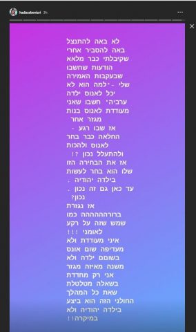 בפוסט שפרסמה בסטורי באינסטגרם האישי שלה, כתבה: "מקווה ממש שימוצה הדין עם החלאות האלה! נמאסתם כבר בהמות ישמעאל ואני רואה בזה אירוע לאומני לכל דבר", והוסיפה: "הוא לא יכול לאנוס ילדה מהכפר שלו?! דווקא יהודייה?".