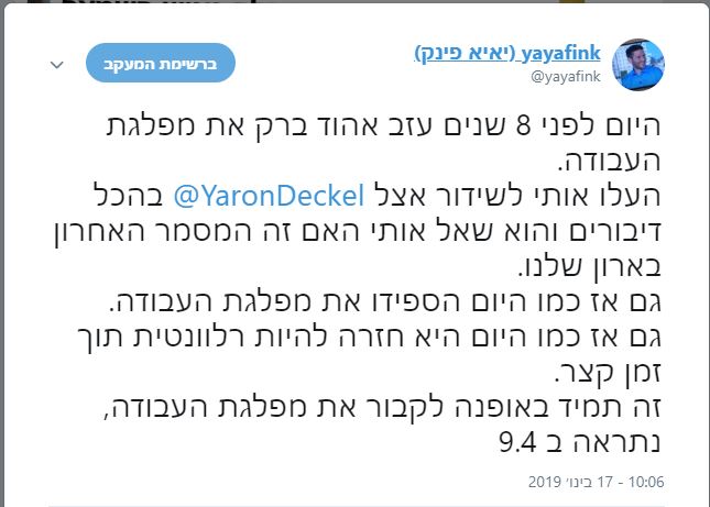 "היום לפני 8 שנים עזב אהוד ברק את מפלגת העבודה. העלו אותי לשידור אצל ירון דקל ב'הכל דיבורים' והוא שאל אותי האם זה המסמר האחרון בארון שלנו." צייץ יאיא פינק לפני כחצי שנה, במהלך קמפיין הבחירות של מפלגת העבודה.